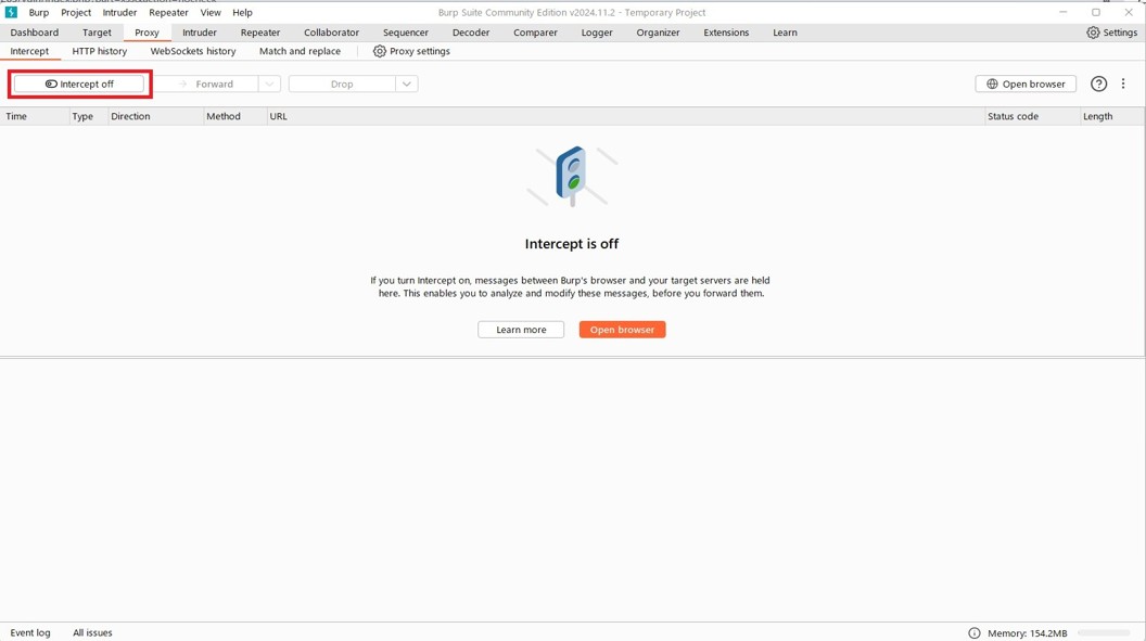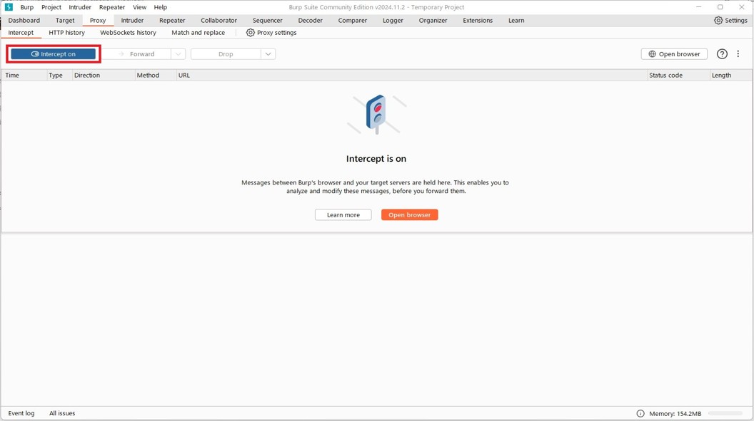まず、Burp Suiteを開きます。次に、上部にある「Proxy」タブを選び、さらに「Intercept」タブを選択してください。これで、通信を監視する準備が整います。