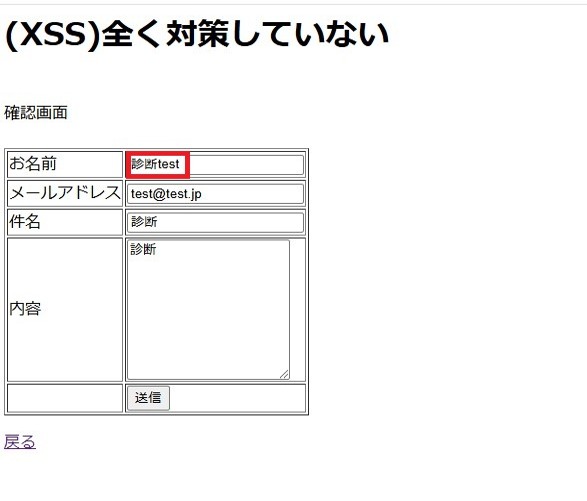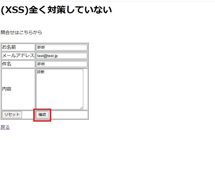 Burp Suite用ブラウザで、ボタンを押して通信を発生させます。(画像の場合は、「確認」ボタン)このボタンを押すと、データがサーバーに送られようとする瞬間に、Burp Suiteがその通信を止めます。