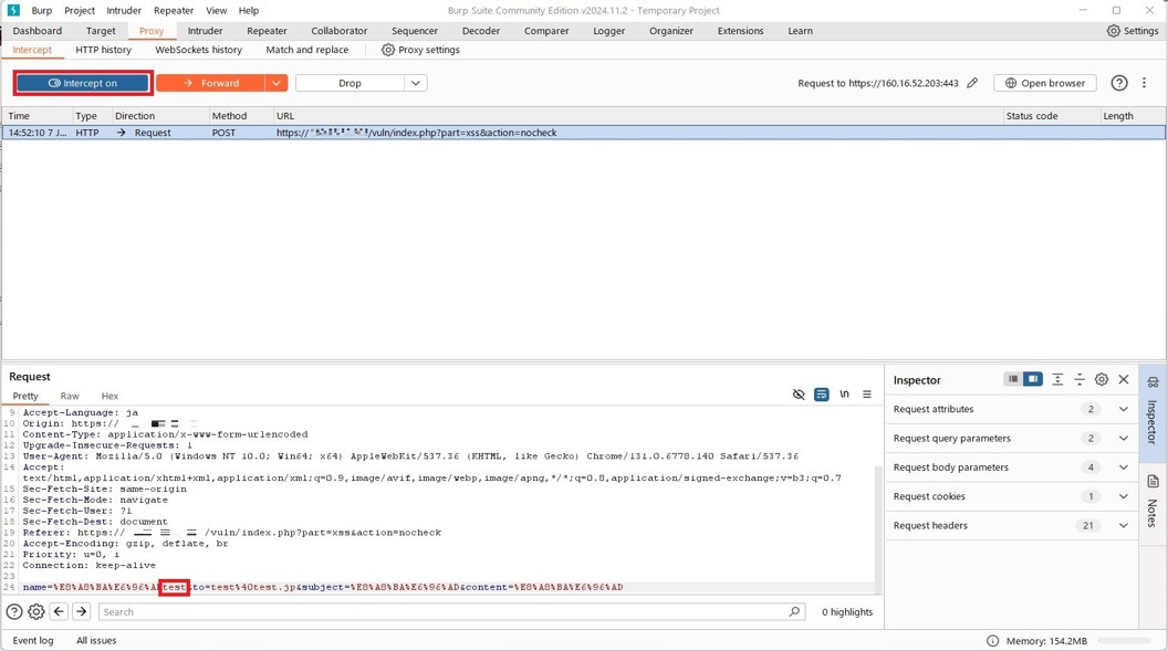 通信が止まったら、「Request」項目内で変更したい部分(画像の場合は「name」の後ろに「test」)を追加します。これにより、サーバーに送るデータを改ざんすることができます。